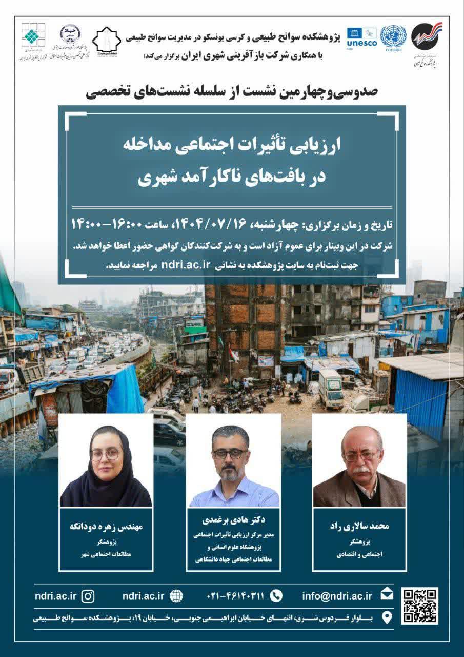 به گزارش روابط عمومی پژوهشگاه علوم انسانی و مطالعات اجتماعی جهاددانشگاهی؛ صد و سی و چهارمین نشست از سلسله نشست های تخصصی "ارزیابی تأثیرات اجتماعی مداخله در بافتهای ناکارآمد شهری" برگزار میشود. این سلسله نشست با همکاری پژوهشکده سوانح طبیعی و کرسی یونسکو در مدیریت سوانح طبیعی و مشارکت شرکت بازآفرینی شهری ایران برگزار می شود.