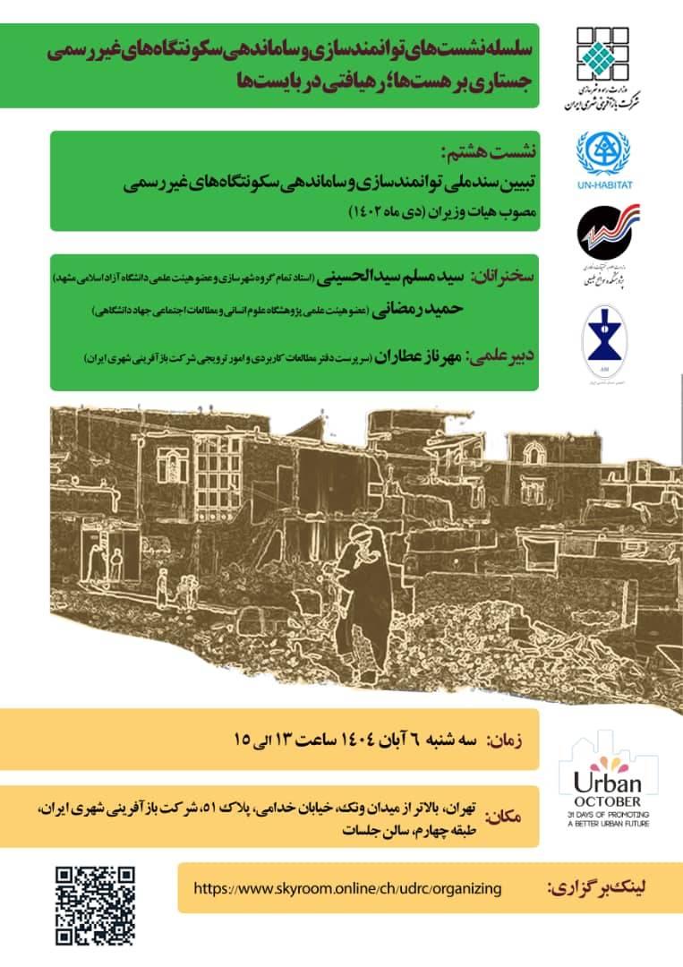 به گزارش روابط عمومی پژوشگاه، نشست هشتم از سلسله نشستهای تخصصی «توانمندسازی و ساماندهی سکونتگاههای غیررسمی» با موضوع تبیین سند ملی توانمندسازی و ساماندهی سکونتگاههای غیررسمی مصوب هیئت وزیران (۱۴۰۲)، سهشنبه ۶ آبانماه ۱۴۰۴ از ساعت ۱۳ تا ۱۵ برگزار میشود.