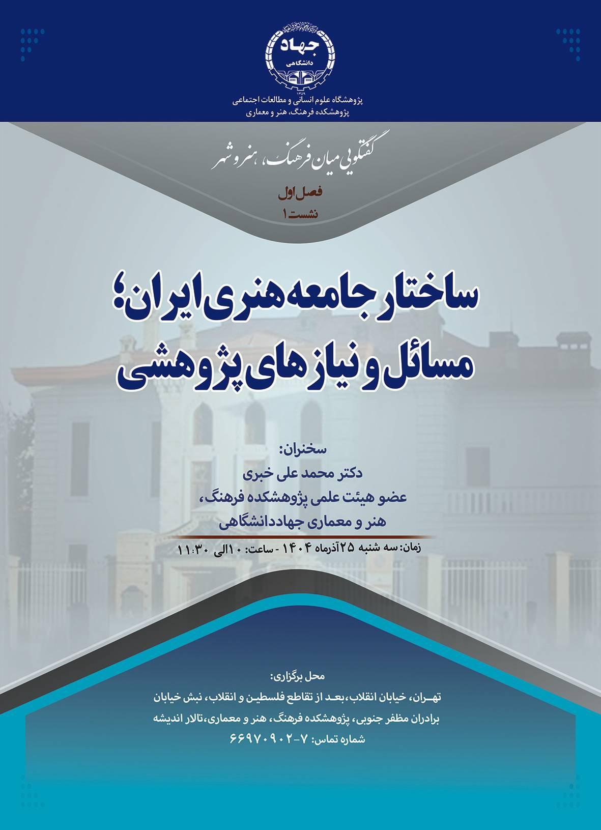 اولین نشست تخصصی با عنوان «ساختار جامعه هنری ایران؛ مسائل و نیازهای پژوهشی» برگزار می شود
